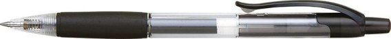 Długopis automatyczny, z wymiennym wkładem_gumowana rękojeść gwarantuje komfort pisania_transparentna obudowa pozwala kontrolować stan tuszu_rękojeść oraz profilowany klips w kolorze tuszu_średnica kulki: 0,5mm_grubość linii pisania: 0,25mm_długość linii pisania: do 760m_certyfikat ISO9001 i EN71_kolor czarny