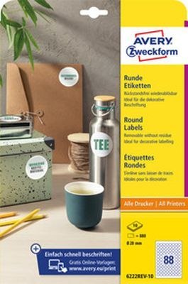 Technologia druku:•INK JET: Tak•LASER: Tak•LASER COLOR: Tak•KSERO: TakCechy produktu:•Rozmiar etykiety (mm): _20•Etykiet / arkusz: 88•Arkuszy/ opakowanie: 10•Etykiet/ opakowanie: 880•Kolor: białe•Format: A4•Rzędów/ arkusz: 8x11•Certyfikaty: FSC