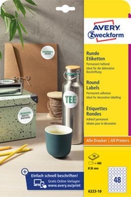 • Etykiety o nietypowych kształtach, A4, 10 ark./op., Q30 mm, okrągłe, trwałe, AVERY ZWECKFORM, 6223.10.01
