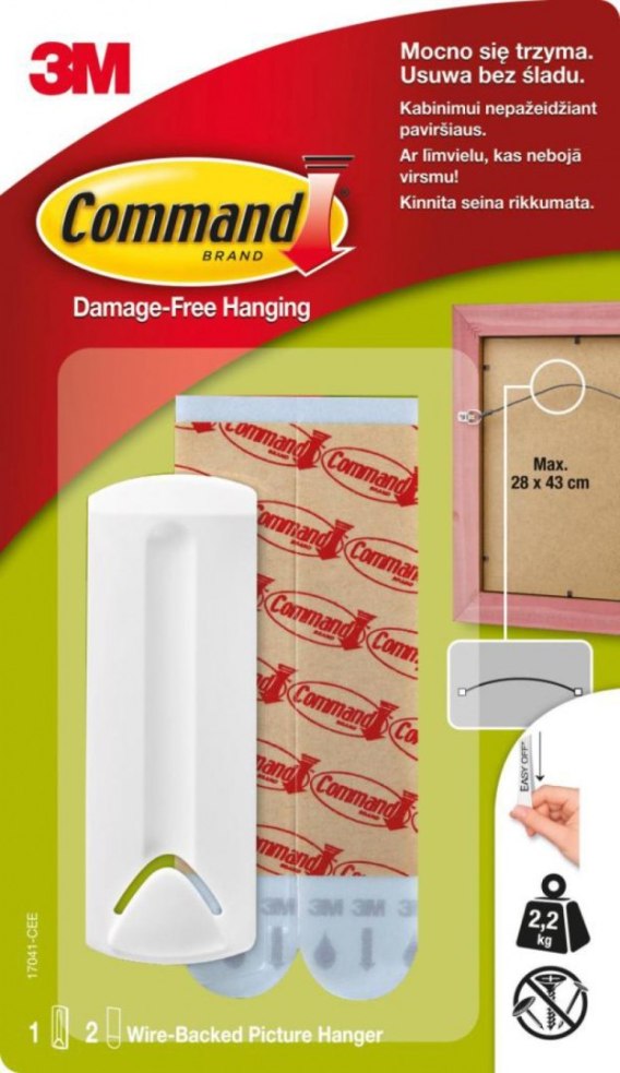 Zapomnij o dziurach w ścianach, pęknięciach w gipsie lub resztkach kleju na ścianie, zastąp gwoździe i śrubokręty Commandem__haki i rzepy Command_ nie niszczą powierzchni oraz samych obrazów i ramek_haczyk przeznaczony do ramek z uchwytem_usunięcie rzepów i haków Command_ jest równie proste jak ich aplikacja, szczególnie kiedy chcesz dowolnie zmienić położenie obrazu lub go zdjąć_dzięki paskom uzupełniającym można ich wielokrotnie używać_opakowanie zawiera: 1 haczyk i 2 duże paski_utrzymuje ramki do: 2,2kg_kolor biały