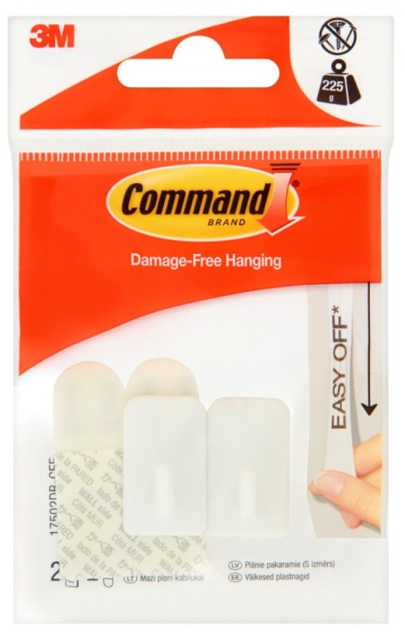 Zapomnij o gwoździach, śrubokrętach czy wiertarkach z Command_ haczyki można łatwo i szybko zamontować_do zastosowania ogólnego_mocno się trzyma, łatwo usuwa_nie niszczy powierzchni_dopuszczalne obciążenie do 225g na 1 pasek_w opakowaniu 2_haki i 2_małe_paski_kolor: biały