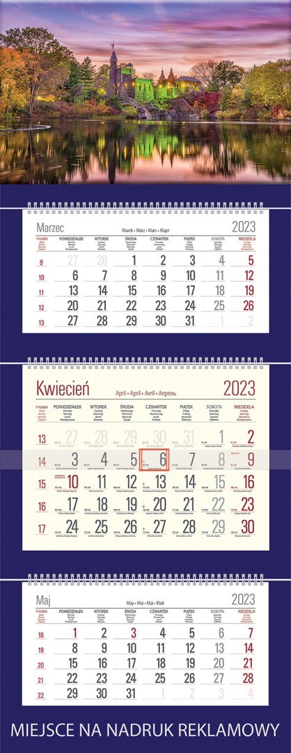 Format 380 x 990 mm, format główki 380 x 240, druk kolorowy, foliowana, kaszerowana, kalendarium 3 x 12 plansz, papier kalendarium offset 80g, zasadnicze kremowe, pomocnicze białe, druk kalendarium 2 kolory, podkład granatowy, oprawa spiralna o-wire, pol
