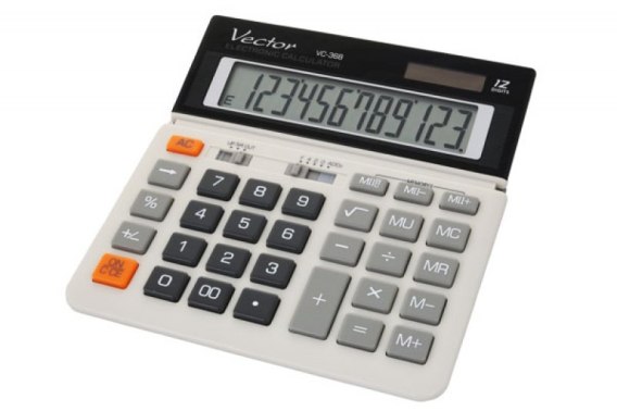 12-cyfrowy wyświetlacz_Podwójne zasilanie_podwójna pamięć_Wymiary: 154x 152x 29mm_obliczanie marży_klawisz cofania_obliczanie % i pierwiastków_klawisz zmiany znaku +/-_Plastikowe przyciski_Zaokrąglanie wyników_6 lat gwarancji_kolor: biały