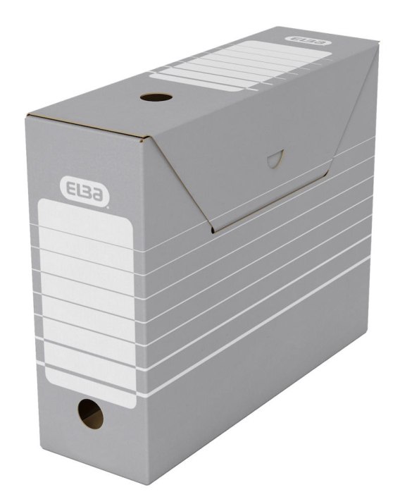 Kartony archiwizacyjne uniwersalne Elba__ do przechowywania dokumentów A4 wypiętych z segregatora lub teczek zawieszanych__ możliwość ustawiania kartonów poziomo lub pionowo__ na grzbiecie miejsce do opisu i otwór ułatwiający wyjmowanie __ perforacja w górnych bokach kartonu umożliwia przechowywanie teczek zawieszkowych