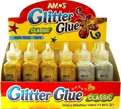 Klej z brokatem AMOS__dekoracyjny klej w płynie zawierający drobinki brokatu, przeznaczony do dekoracji_papieru, kartonu, drewna i innych powierzchni__wygodny: namaluj wzór za pomocą kleju i poczekaj aż zaschnie__nie wymaga dodatkowych akcesoriów__nie brudzi, nie rozsypuje się__po zaschnięciu drobinki brokatu nie wykruszają się__możliwe jest łączenie Glitter Glue z innymi technikami:_farbami witrażowymi, Ciasto-Plasto__zgodne z normą CE i z wymaganiami ACM Institute INC. USA__jednostka sprzedaży 1 opakowanie