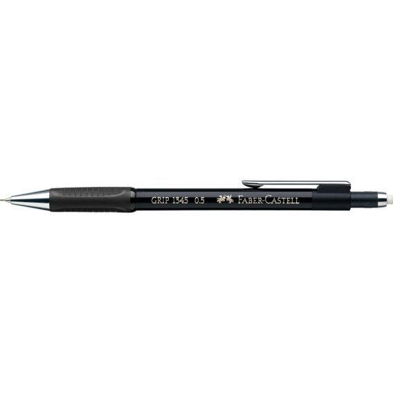 Ołówek automatyczny Grip 1345 Faber-Castell w metalicznym kolorze czarnym. Popularny ołówek automatyczny w nowym atrakcyjnym designie. Wygodny i precyzyjny. Wysoce ergonomiczny, dzięki nowej antypoślizgowej, gumowej strefie uchwytu. Specjalna chowana do wewnątrz osłonna zabezpieczająca grafit przed pęknięciem podczas pisania. Wyposażony we wciskany mechanizm wysuwania i chowania wkładu, uruchamiany poprzez naciśnięcie przycisku. Ze zintegrowaną, wyjątkowo długą, wysuwaną gumką i metalowym klipsem. Średnica grafitu: 0,5 mm, szerokość linii pisania B.