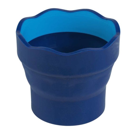 Składany kubek na wodę Clic&Go Faber-Castell w kolorze niebieskim. Praktyczny, wykonany z miękkiego, wytrzymałego i antypoślizgowego tworzywa. Dzięki możliwości łatwego złożenia zajmuje niewiele miejsca. Pozwala utrzymać miejsce pracy w czystości i porządku. To doskonały pomocnik podczas artystycznej zabawy. Może być również używany jako pojemnik np. na szczoteczki. Specjalnie profilowana falista krawędź pozwala na wygodne odłożenie pędzelka. Łatwy do czyszczenia. Dostępny w kilku wersjach kolorystycznych.