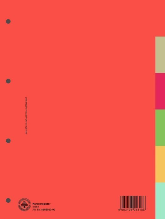 Wykonana z kartonu 210g/m_ uzyskanego na drodze recyclingu_pakowana jednostkowo w folię ochronną_format: A4_dziurkowanie: 4_kolor przekładki odpowiada kolorowi indeksu