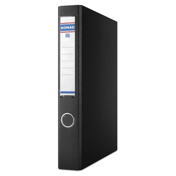Wykonany z tektury o grubości 1,9mm i gramaturze 1170gsm_posiada Zielony Punkt (Der Gr_ne Punkt) - udział w systemie recyklingu i odzysku odpadów wynikający z przepisów prawa polskiego i UE_pokryty ekologiczną folią polipropylenową (100_m) o strukturze płótna_wewnątrz biała wyklejka papierowa_2-pierścieniowy mechanizm w kształcie litery D_średnica pierścieni: 30mm_wymienna, obustronna etykieta grzbietowa_wzmocniony, niklowany otwór na palec_szerokość grzbietu: 45mm_wymiary: 45x320x285mm_2 lata gwarancji na mechanizm_kolor czarny