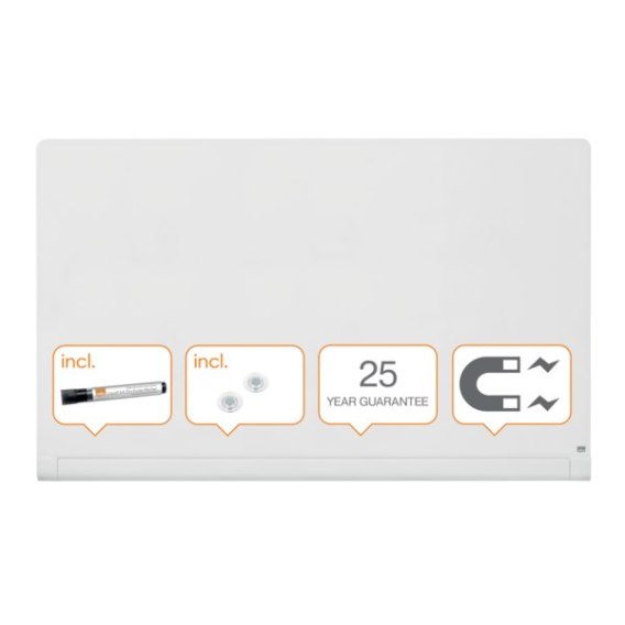 Dzięki panoramicznej szklanej tablicy suchościeralnej Nobo Twoje pomysły zostaną zauważone!_jej panoramiczny format zapewni Ci dużą powierzchnię do pisania_szklana powierzchnia magnetyczna wygląda bardzo elegancko i stylowo_ma zaokrąglone narożniki, długą na całą szerokość tablicy półkę na markery_zapewnia ultrawysoki poziom ścieralności, także przy częstym użytkowaniu_system InvisaMount_ sprawia, że instalacja jest łatwa, a mocowania są starannie ukryte z tyłu tablicy_rozmiar: 85__wymiary: 188x106cm_gwarancja: 25 lat_kolor: biały