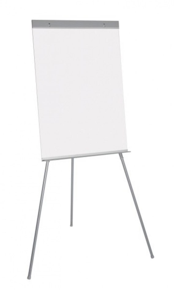 Flipchart z tablicą o powierzchni suchościeralnej stabilna, lekka konstrukcja z trójnogiem kompaktowa konstrukcja bez ramy regulowana wysokość wyposażony w metalową półkę na markery, gąbkę, magnesy odsłonięte haczyki ułatwiają zakładanie bloków papieru za