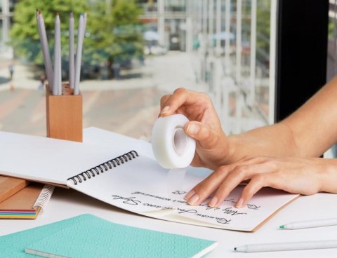 Najwyższej jakości matowa taśma biurowa_po naklejeniu staje się niewidoczna_łatwo odkleja się od większości powierzchni_można po niej pisać_nie zostawia smug na fotokopiach_nie żółknie z upływem czasu_odrywanie bez konieczności używania nożyczek_szerokość: 19mm_długość: 33m