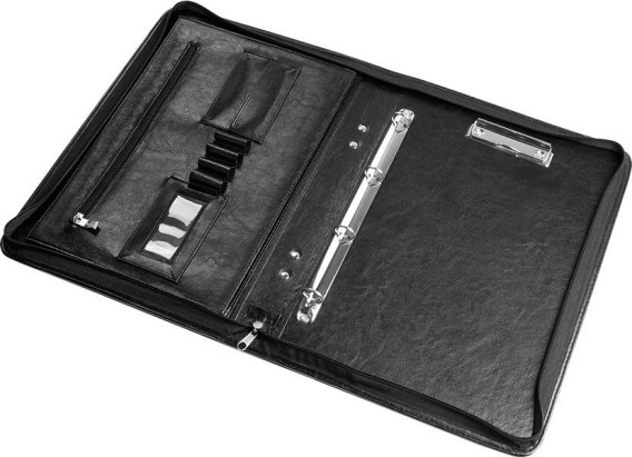 - teczka wykonana z wysokiej jakości ekoskóry_- zamykana na suwak_- grzbiet 50 mm_- wyposażona w kieszeń przestrzenną, kieszeń zamykaną na suwak, 2 kieszonki na wizytówki, kieszeń z okienkiem na wizytowniki, miejsce na długopis, ring 4R do wpinania, klip do utrzymywania notesu lub notatek