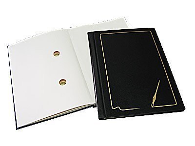Okładka twarda, oprawiona w okleinę powleczoną PVC. Grzbiet kryty. Blok z kartonu barwionego. Zawiera 20 kart z 2 otworami.