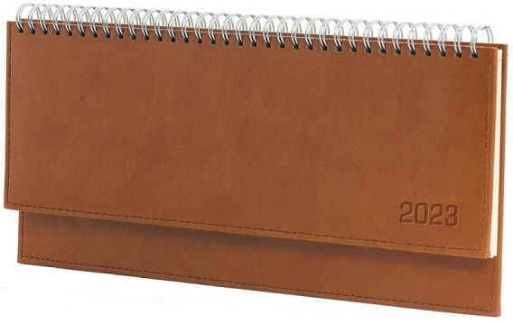 - Elegancki terminarz leżący na biurko w oprawie z materiału pokryciowego Vivella w dziesięciu kolorach. Okładka obszyta nićmi. Terminarz zawiera przejrzyste kalendarium w układzie tygodniowym oraz część informacyjną. Spirala w kolorze srebrnym. Możliwość wykonania tłoczeń reklamowych na oprawie kalendarza na obszarze o wymiarach 290 x 90 mm oraz 300 x 20 mm