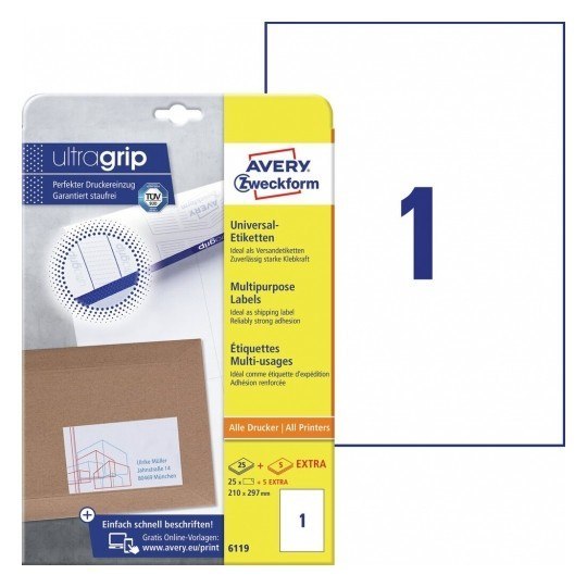 Etykiety uniwersalne A4 25 arkuszy + 5 arkuszy Extra 210 x 297 mm białe Avery Zweckform |
