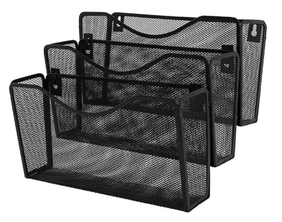 Półka wykonana z metalowej siateczki powlekanej lakierem_do instalacji naściennej_możliwość wykorzystania szuflad jako zestaw lub pojedynczo_specjalne otwory na haczyki_obniżone krawędzie od strony zewnętrznej ułatwiają wyjmowanie dokumentów_wymiary zestawu: 325x230x330mm_wymiary pojedynczej szuflady: 325x88x170mm_kolor czarny