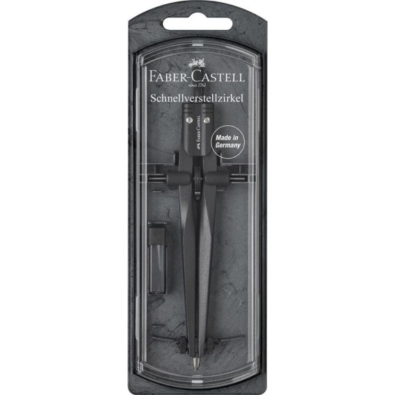 Cyrkiel Faber-Castell z serii Stream 2019 w kolorze kamiennej czerni (black stone). Doskonały dla uczniów i studentów. Wyjątkowy design i funkcjonalność. Produkt wyposażony jest w prosty mechanizm regulujący za pomocą śruby oraz centralnego pokrętła. Solidna technologia, wytrzymały mechanizm i antypoślizgowe igły zapewniają precyzję i komfort użytkowania. Maksymalna średnica okręgu wynosi około 340 mm. Zestaw zawiera pojemnik z zapasowymi rysikami grafitowymi. Dostarczany w praktycznym plastikowym etui. Wyprodukowany w Niemczech.