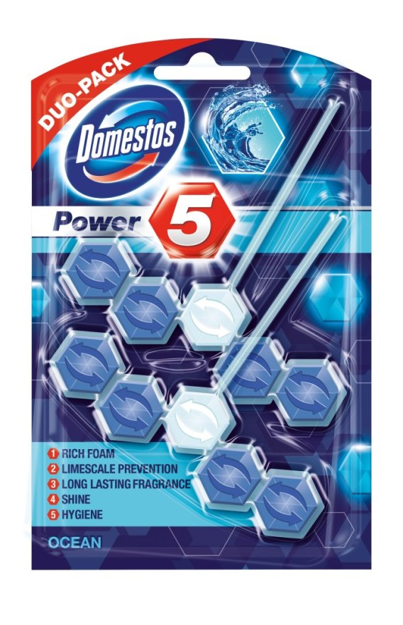 Kostka toaletowa Domestos Power 5 to kompleksowy produkt, który zapewni Twojej toalecie bezpieczeństwo i czystość: higienę, ochrona przed kamieniem, pianę, świeżość i połysk. Czy można oczekiwać czegoś więcej od kostki toaletowej?