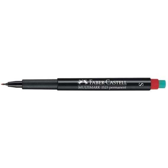 Marker uniwersalny permanentny Multimark Faber-Castell w kolorze czerwonym. Z fibrową końcówką i zintegrowaną specjalną gumką. Niezawodny na prawie wszystkich powierzchniach np. metal, szkło, plastik (PP, PET, PVC itd.), płyty CD/DVD, folie do projektorów, kamień, drewno. Szybkoschnący, intensywny tusz odporny na działanie światła i wody. Rozpuszczalny w wodzie. Specjalna zintegrowana gumka sprawnie dokona korekt na prawie wszystkich gładkich powierzchniach. Szerokość linii pisania: S (0,4 mm). Dostępny 3 szerokościach linii: S, F i M, również w wersji niepermanentnej. Obudowa i zatyczka wykonane z tworzywa pochodzącego z recyklingu.