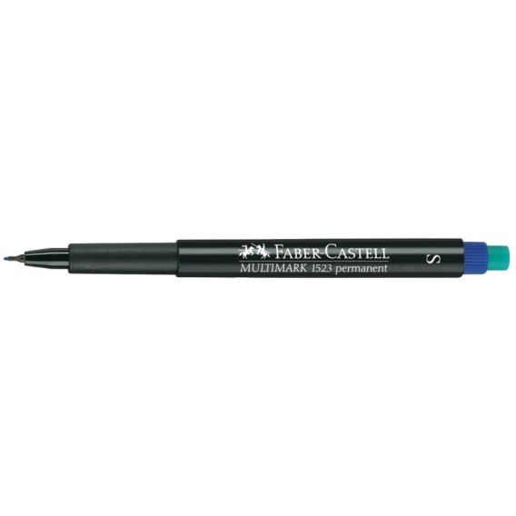 Marker uniwersalny permanentny Multimark Faber-Castell w kolorze niebieskim. Z fibrową końcówką i zintegrowaną specjalną gumką. Niezawodny na prawie wszystkich powierzchniach np. metal, szkło, plastik (PP, PET, PVC itd.), płyty CD/DVD, folie do projektorów, kamień, drewno. Szybkoschnący, intensywny tusz odporny na działanie światła i wody. Rozpuszczalny w wodzie. Specjalna zintegrowana gumka sprawnie dokona korekt na prawie wszystkich gładkich powierzchniach. Szerokość linii pisania: S (0,4 mm). Dostępny 3 szerokościach linii: S, F i M, również w wersji niepermanentnej. Obudowa i zatyczka wykonane z tworzywa pochodzącego z recyklingu.