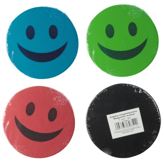 Gąbka magnetyczna przeznaczona do czyszczenia tablic suchościeralnych. Zdobiona nadrukiem uśmiechniętej buźki.