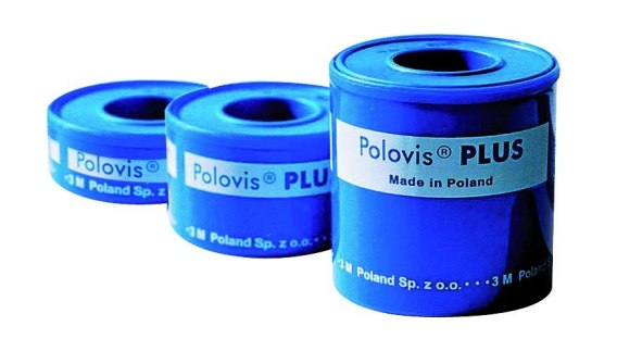 Polovis_ Plus__ przylepiec z tkaniny bawełnianej, pokrytej jednostronnie _klejem akrylowym__ bardzo duża wytrzymałość mechaniczna__ odporny na wodę__ łatwy do dzielenia bez użycia nożyczek__ przylepiec o wysokiej przylepności początkowej, natych-_miast przykleja się do skóry (nawet wilgotnej)__ nie pozostawia zabrudzeń na skórze__ nawinięty na szpulkę z tworzywa sztucznego i zabezpie-_czony pierścieniem, który chroni przed zabrudzeniem