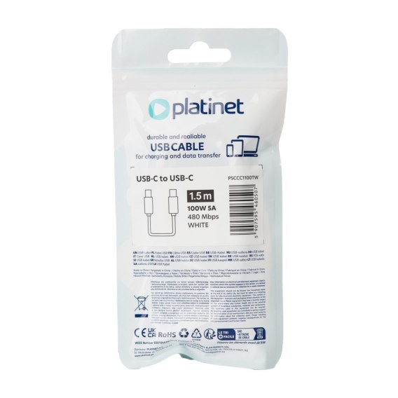 • Kabel TYPE USB-C to USB-C, biały, 1.5m, 100W (5A), 480 MBPS TPE, PLATINET PSCCC1100TW