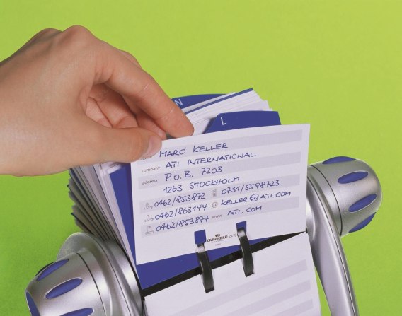 Kartoteka obrotowa na wpisy numerów telefonów i adresów. Z wysokojakościowego tworzywa sztucznego o ekskluzywnym wzornictwie. 500 kart do obustronnego opisania o formacie 72 x 104 mm. Alfabetyczne, 25-cio częściowe przekładki od A-Z. Opis kart poprzez ich łatwe wyjęcie i włożenie. Wymiary: 21,5 x 12,0 x 18,5 cm (SxWxG)