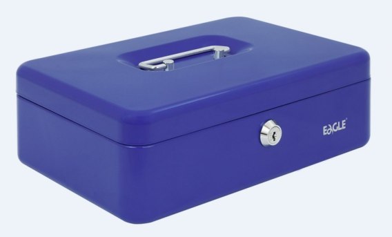 Kasetka na pieniądze Eagle__ wykonana z metalu, zamykana na kluczyk__ posiada plastikowy wkład na bilon__ dostępna w trzech kolorach: czarny, czerwony, niebieski__ jednostka sprzedaży 1 sztuka