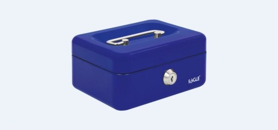 Kasetka na pieniądze Eagle__ wykonana z metalu, zamykana na kluczyk__ posiada plastikowy wkład na bilon__ dostępna w trzech kolorach: czarny, czerwony, niebieski__ jednostka sprzedaży 1 sztuka