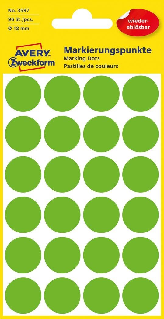 | Nazwa B2B | Usuwalne kółka do zaznaczania _18mm, 96szt./op. zielone 3596 Avery Zweckform |