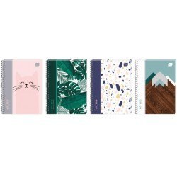 Pojedyncza spirala wkręcana. Otwory do segregatora. Perforacja wzdłuż grzbietu, ułatwiająca wyrywanie kartek. Spirala po długim boku. Lakierowane elementy na okładce.