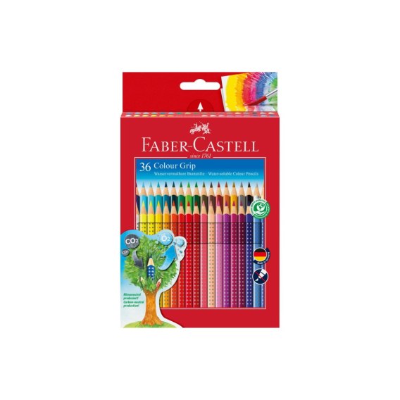 Kredki Colour Grip 2001 Faber-Castell 36 szt. w opakowaniu kartonowym. Doskonałe do wielu technik artystycznych, dla hobbystów i starszych dzieci. Zachwycają żywymi i intensywnymi kolorami. Posiadają wysokiej jakości rozpuszczalny w wodzie pigment, umożliwiający osiągnięcie efektu jak przy wykorzystaniu tradycyjnych akwareli. To gwarancja fantastycznych rezultatów i doskonałej zabawy. Wystarczy kilka ruchów wilgotnym pędzlem po narysowanym wzorze, by wydobyć wyjątkowy efekt obrazu akwarelowego. Wyjątkowo gładkie i miękkie w aplikacji. Ergonomiczny trójkątny kształt i charakterystyczna dla tej serii opatentowana strefa Grip z małymi, antypoślizgowymi punktami zapewniają wysoki komfort użytkowania i niemęczące, wygodne rysowanie. Odpowiednie również dla leworęcznych. Kolory spieralne z większości tkanin. Grafity są wysoko odporne na pękanie, dzięki bezpiecznemu procesowi wiązania (SV). Wykonane z certyfikowanego drewna pochodzącego ze zrównoważonego i odpowiedzialnie zarządzanego leśnictwa. Powierzchnie pokryte lakierem na bazie wody _ bezpiecznym dla środowiska i zdrowia dzieci. Emisja CO2 spowodowana procesem produkcyjnym tych produktów jest neutralizowana przez certyfikowane projekty. Dostępne w różnych kolorach i różnych zestawach.