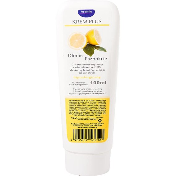 Glicerynowy krem do rąk z wyciągiem z cytryny. Zawiera witaminy A, E, B5, lanolinę, alantoinę oraz olej silikonowy.