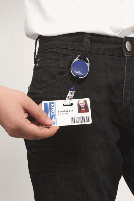 Mechanizm ściągający STYLE Durable_- Metalowe bezpieczne mocowanie. Przeznaczony do identyfikatorów. Linka wyciągana na długośc 80 cm. Trzy kolory: czarny, granatowy i szary._- jednostka sprzedazy 1 opakowanie
