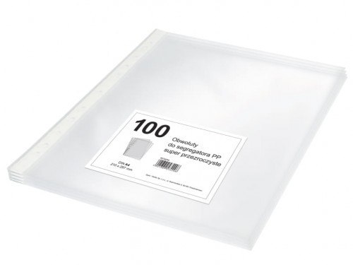 Obwoluta A4, 100 sztuk, superprzezroczysta__ Obwoluty ochronne do segregatora_ na dokumenty, wykonane z folii PP, przezroczyste, dziurkowanie europejskie, A4, 100 szt. w folii,_ superprzezroczysta