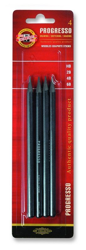 Komplet 4 miękkich ołówków bezdrzewnych Progresso wykonanych w całej masie z czystego grafitu o twardościach HB-2B-4B-6B._Pokryte są bezbarwnym lakierem przez co nie brudzą rąk.
