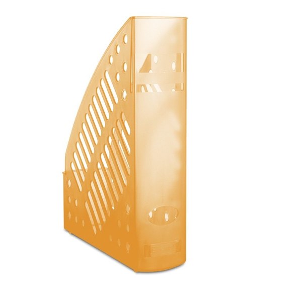 Pojemnik na dokumenty, ażurowy, wykonany z twardego, odpornego na pęknięcia polistyrenu_posiada Zielony Punkt (Der Gr_ne Punkt) - udział w systemie recyklingu i odzysku odpadów wynikający z przepisów prawa polskiego i UE_szerokość grzbietu: 70mm_pojemność: do 700 kartek o gramaturze 80gsm_sztywna konstrukcja o zwiększonej stabilności_ścięte boki ułatwiają wkładanie i wyjmowanie dokumentów_tworzywo przeznaczone do recyklingu_wymiary: 70x315x240mm_kolor transparentny pomarańczowy