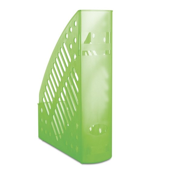 Pojemnik na dokumenty, ażurowy, wykonany z twardego, odpornego na pęknięcia polistyrenu_posiada Zielony Punkt (Der Gr_ne Punkt) - udział w systemie recyklingu i odzysku odpadów wynikający z przepisów prawa polskiego i UE_szerokość grzbietu: 70mm_pojemność: do 700 kartek o gramaturze 80gsm_sztywna konstrukcja o zwiększonej stabilności_ścięte boki ułatwiają wkładanie i wyjmowanie dokumentów_tworzywo przeznaczone do recyklingu_wymiary: 70x315x240mm_kolor transparentny zielony