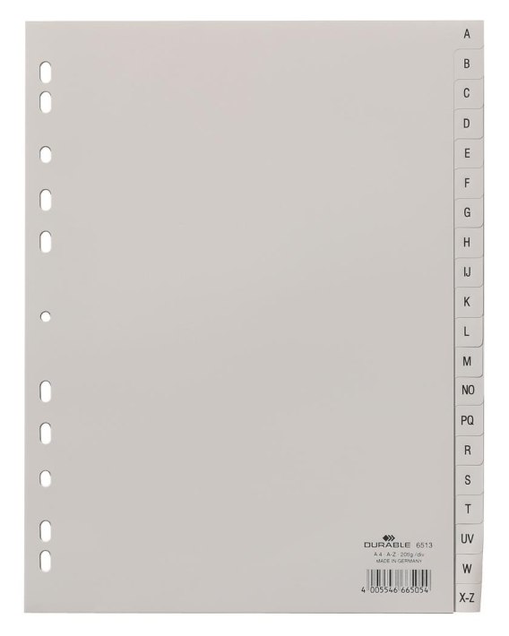 Przekładki PP A4 szare, nadruk indeks, A-Z 20 części Szary 651310 DURABLE