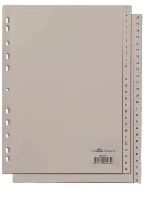 Przekładki numeryczne, PP, A4 pionowe. Wymiary: (W x S) mm: 297 x 215/230. Indeksy drukowane 1 _ 52, Części: 52, Otwory: układ uniwersalny, dwie sekwencje (1 _ 26, 27 _ 52)