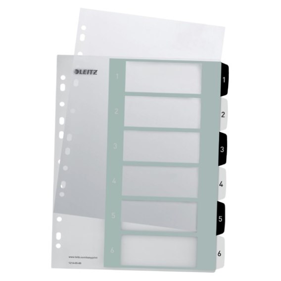 Wydrukuj elegancki i ekskluzywny spis treści za pośrednictwem www.leitz.com/easyprint_Mocne i trwałe, z wytrzymałego polipropylenu o grubości 0,3 mm_Format A4 Maxi pozwala na szybki dostęp do dokumentów, nawet w przypadku, gdy są włożone do koszulek_6 przekładek numerycznych 1-6 ułatwiających sortowanie_11 uniwersalnych dziurek umożliwiających wpinanie do segregatora