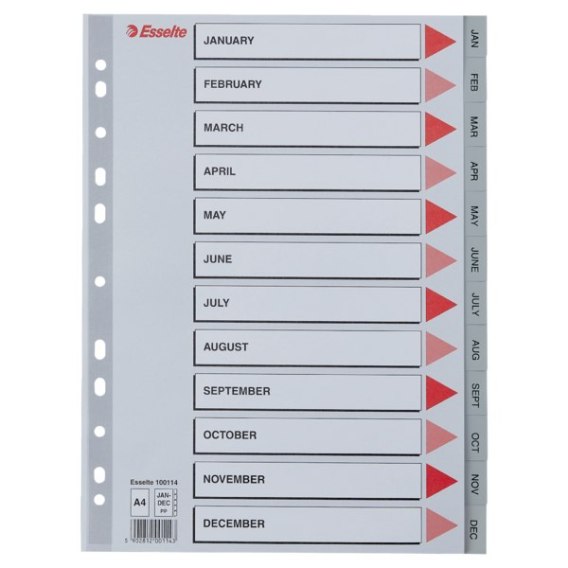 | Nazwa B2B | Przekładki plastikowe szare PP numeryczne A4 ESSELTE, 12 miesięcy |