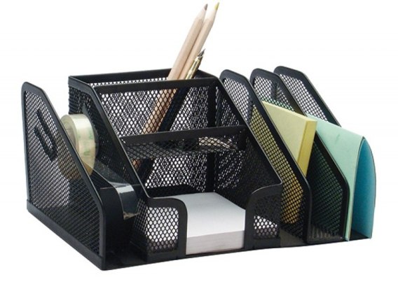 Przybornik na biurko, wykonany z metalowej siateczki powlekanej lakierem_3 przegrody na korespondencję_1 komora na artykuły piśmienne_1 komora na drobne akcesoria biurowe (gumki, spinacze, itp.)_1 komora na karteczki_1 przegroda z dyspenserem do taśmy_posiada gumowe nóżki_wymiary: 205x145x100mm_kolor czarny