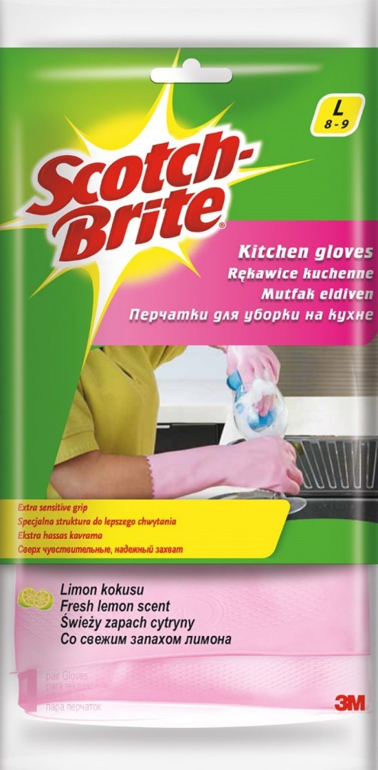 Rękawice kuchenne SCOTCH-BRITE_ są wykonane ze specjalnej struktury materiału, który umożliwia lepsze chwytanie_są niezwykle elastyczne i wytrzymałe_można je używać wielokrotnie z zachowaniem takich samych właściwości_świeży zapach cytryny sprawia, że każde użycie jest przyjemnym doświadczeniem_100% bawełniana wyściółka sprawia, że rękawice są wyjątkowo miękkie, dodatkowo pochłaniają pot i pomagają zachować suche ręce_opakowanie zawiera 1 parę rękawic kuchennych Scotch-Brite_rozmiar: L_kolor: różowy