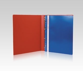Wykonany z wysokiej jakości folii PCV z przezroczystymi kieszeniami na przedniej okładce i grzbiecie, które umożliwiają umieszczenie materiałów reklamowych. Wyrób wyposażony w mechanizm 4-ringowy w kształcie litery _R_. Szerokość grzbietu 2,5cm. Zamek umieszczony na tylnej okładce.