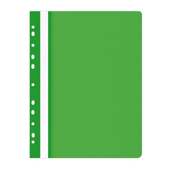 Wykonany z polipropylenu_strona przednia transparentna - grubość: 100_m_strona tylna kolorowa - grubość: 170_m_mieści ok. 200 kartek_posiada 11 dziurek do wpięcia do segregatora_wymienny, dwustronnie zapisywalny papierowy pasek brzegowy_format: A4_rozmiar: 237x310mm_kolor zielony