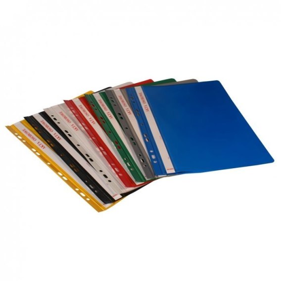 Obie okładki sztywne, nieprzezroczyste z wysokiej jakości kolorowej folii, wyposażony w wysuwany, papierowy pasek do opisu, zaokrąglone rogi obu okładek, posiada boczną perforację, jednostka sprzedaży 1 opakowanie (10 sztuk).