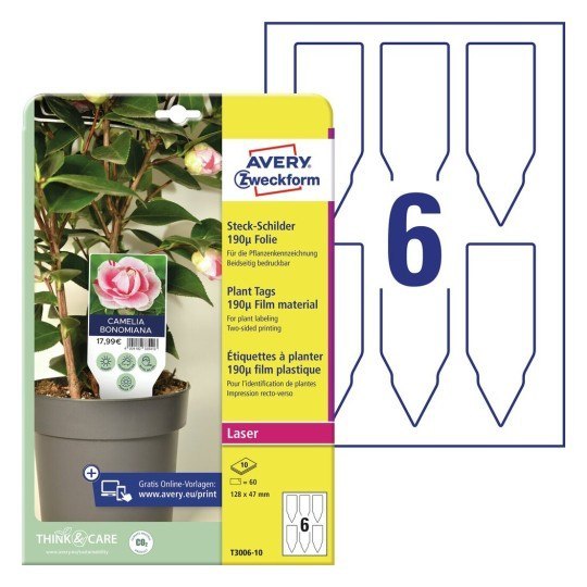 Białe, dwustronne, foliowe tabliczki do oznaczania roślin, do zadruku___ Tabliczki są wodoodporne i idealne np. do: oznaczania i opisywania roślin w szkółkach oraz centrach ogrodniczych, do oznaczania cen i opisywania produktów w handlu detalicznym, hurtowym, a także w rolnictwie. Są również odpowiednie do użytku prywatnego w ogrodnictwie i gospodarstwie domowym.__ Wyjątkowo wytrzymałe tabliczki foliowe do umieszczania w miękkim podłożu są wodoodporne, odporne na rozdarcia, chemikalia oraz promieniowanie UV _ są zatem odpowiednie również do użytku zewnętrznego.__ Solidna jakość folii zapobiega przypadkowemu rozdarciu tabliczek.__ Tabliczki foliowe do oznaczania roślin można dwustronnie zadrukować, dzięki czemu idealnie nadają się do zamieszczania dodatkowych informacji na odwrocie.__ Łatwe i wygodne w użyciu: po wydrukowaniu arkuszy A4 pojedyncze tabliczki można łatwo oddzielić od arkusza.__ Tabliczki są odpowiednie do zadruku we wszystkich standardowych drukarkach laserowych, a powierzchnia foliowego materiału zapewnia najwyższą jakość druku.__ Darmowe i łatwe w użyciu szablony oraz oprogramowanie do projektowania produktów Avery Zweckform jest dostępne na stronie www.avery-zweckform.pl.__ Think & Care _ Firma Avery Zweckform od 2020 roku jest neutralna dla klimatu: emisje gazów cieplarnianych w zakładzie firmy są równoważone przez certyfikowane projekty ochrony klimatu. Od 2014 roku wykorzystywana jest wyłącznie ekologiczna energia elektryczna/gaz. Badania, rozwój, produkcja, logistyka oraz administracja w siedzibie firmy w Oberlaindern w Bawarii gwarantują najwyższe standardy jakości i ochrony środowiska oraz krótkie trasy dostaw. Tabliczki foliowe są produkowane w sposób neutralny dla klimatu, a emisja gazów cieplarnianych z materiału jest kompensowana._